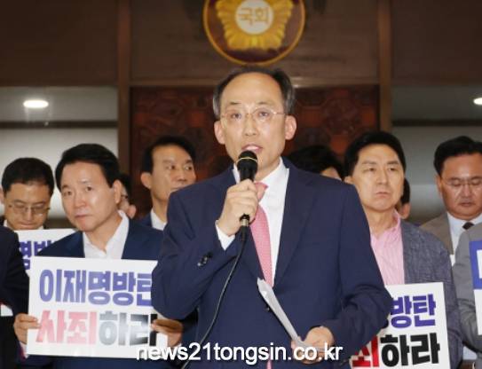 추 원내대표는 특히 민주당이 검사 4명에 대한 탄핵을 추진하는 데 대해 "방탄용 탄핵쇼"라며 "법정 밖의 사건을 끌어내 이재명 대표의 형사 처벌을 어떻게든 모면해보려는 수작"이라고 비난했다.