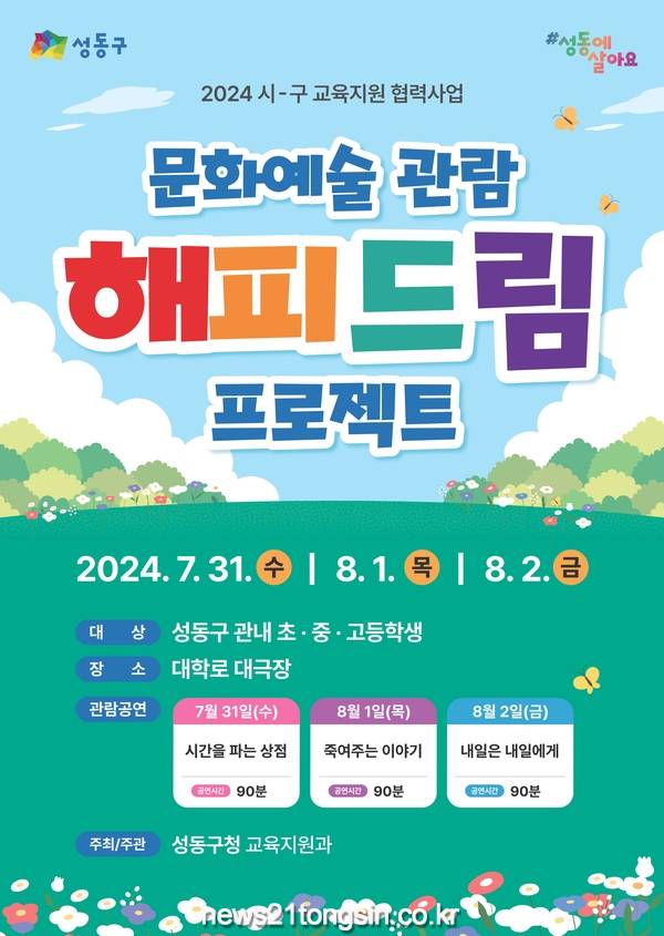 정원오 성동구청장은 “‘해피드림 프로그램’에 참여하는 학생들이 공연을 관람하며 좋은 추억도 쌓고, 진로 선택에도 많은 도움이 되길 바란다”라며, “앞으로도 청소년들의 꿈과 역량을 키울 수 있는 양질의 프로그램을 운영해 나갈 것”이라고 말했다.