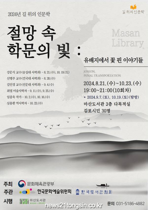 김포시 마산도서관(시장 김병수)은 8월 21일 마산도서관 ‘길 위의 인문학’ 프로그램인 ‘절망 속 학문의 빛 : 유배지에서 꽃 핀 이야기들’을 2개월간 10회 차시(2회 탐방 포함)로 운영한다고 밝혔다.