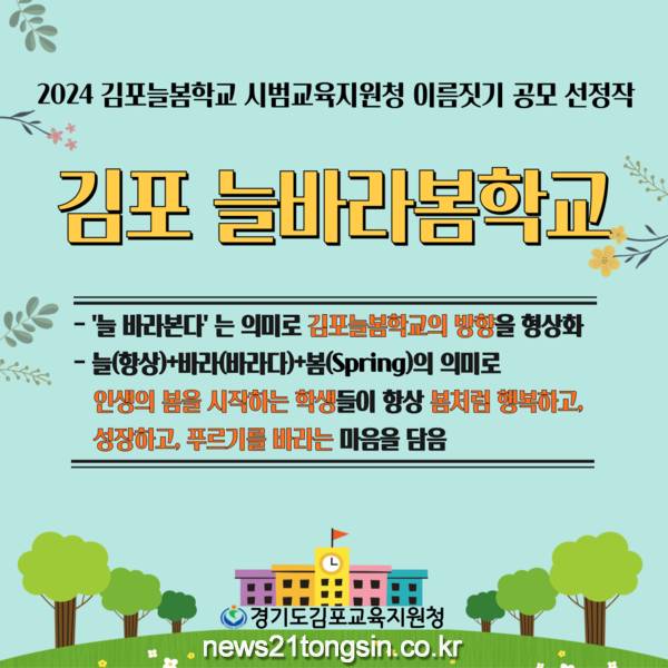 김포교육지원청은 2024 경기형 늘봄학교 업무지원 모델 시범교육지원청으로 선정되어 사업을 추진 중이다. 이에 김포 늘봄학교를 대표할 수 있는 이름을 짓기 위하여 교육공동체의 의견을 모아 5일부터 18일까지 2주간 이름 짓기 공모전을 실시하였다.