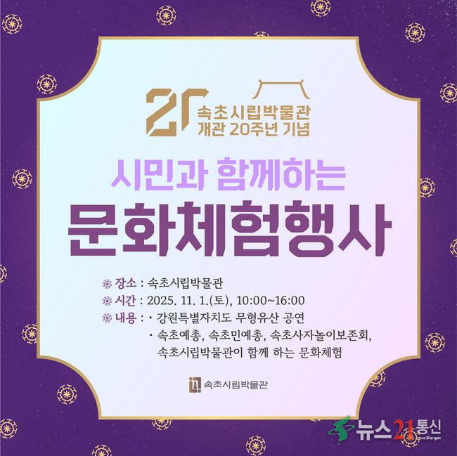 속초시립박물관이 오는 11월 1일(토) 개관 20주년을 맞아 ‘시민과 함께하는 문화체험 행사’를 개최한다.속초시립박물관은 2005년 개관 이래 속초의 독특한 민속문화를 전시하고 직접 체험할 수 있는 문화공간으로 자리매김해 왔으며, 지난 20년간 설악문화와 속초의 정체성을 발굴‧보존하며 지역사회와 함께 성장해왔다.이번 20주년 .
