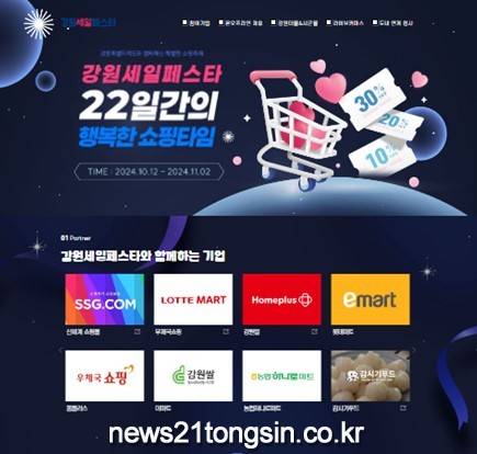 □ 강원세일페스타는 강원특별자치도의 대표 쇼핑 축제로, 강원더몰을 비롯한 18개 시군몰, 강원곳간, 제휴 쇼핑몰 등에서 온라인 및 오프라인 할인 이벤트가 진행된다. 소비자들은 강원더몰과 18개 시군몰, SSG.COM, 우체국 쇼핑에서 최대 30%의 할인 혜택을 누릴 수 있으며, 사회적경제 쇼핑몰인 ‘강원곳간’에서는 김장철을 맞아 절임배추 등 시즌 상품을 할인된 가격으로 구매할 수 있다.