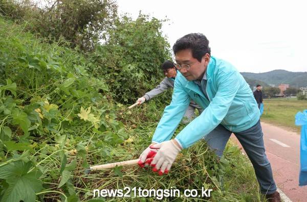 이상일 용인특례시장은 13일 오후 용인시 처인구 '물사랑운동본부' 관계자들과 함께 포곡읍 전대리 인근 경안천에서 환경정화 활동을 하고 봉사자들을 격려했다.