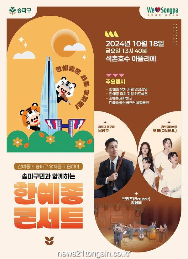 송파구(구청장 서강석)가 오는 10월 18일 13시 40분 석촌호수 아뜰리에에서 ‘송파구민과 함께하는 한예종 콘서트’를 개최한다.