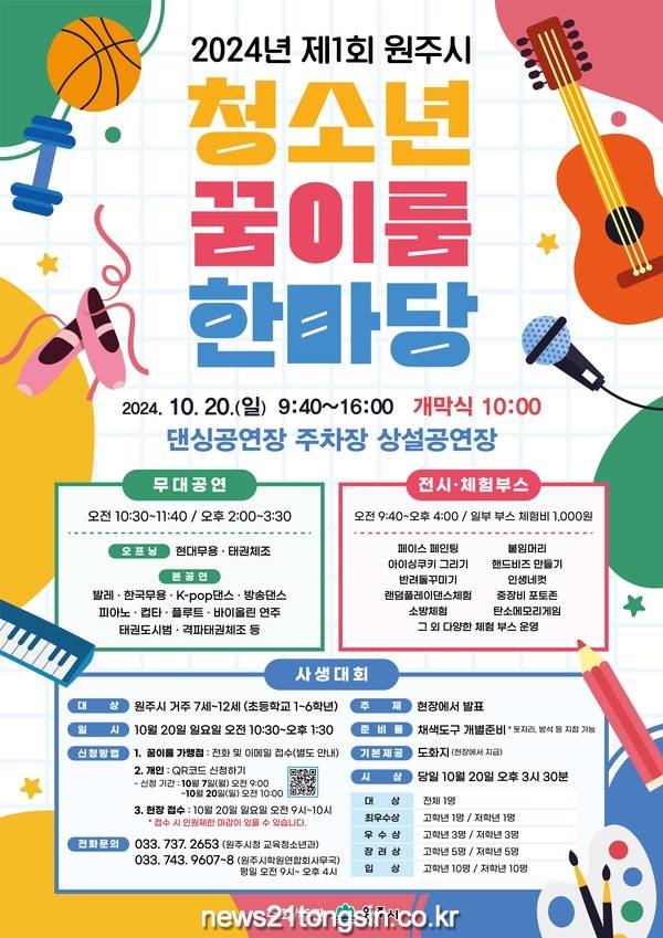 □ 원주시는 오는 20일(일) 오전 10시 댄싱공연장 주차장 상설공연장 일원에서 ‘2024년 제1회 청소년 꿈이룸 한마당’을 개최한다.