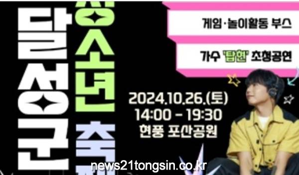 (뉴스21통신) 최우성기자 = 달성군(군수 최재훈)은 오는 10월 26일 오후 2시부터 현풍읍 포산공원에서 청소년과 지역 주민을 위한 ‘2024 달성군 청소년 축제’를 개최한다.