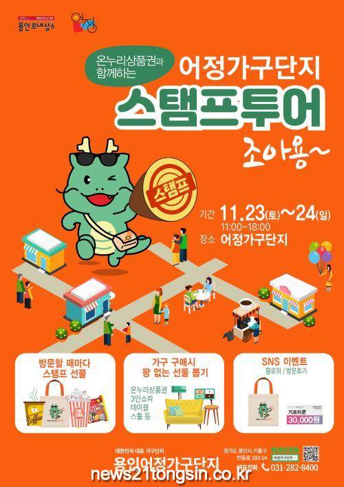 용인특례시(시장 이상일)는 상점가로 지정된 기흥구 어정가구단지(기흥구 언동로 193-14)에서 23~24일 이틀간 ‘스탬프 투어 조아용’ 이벤트를 연다고 22일 밝혔다.