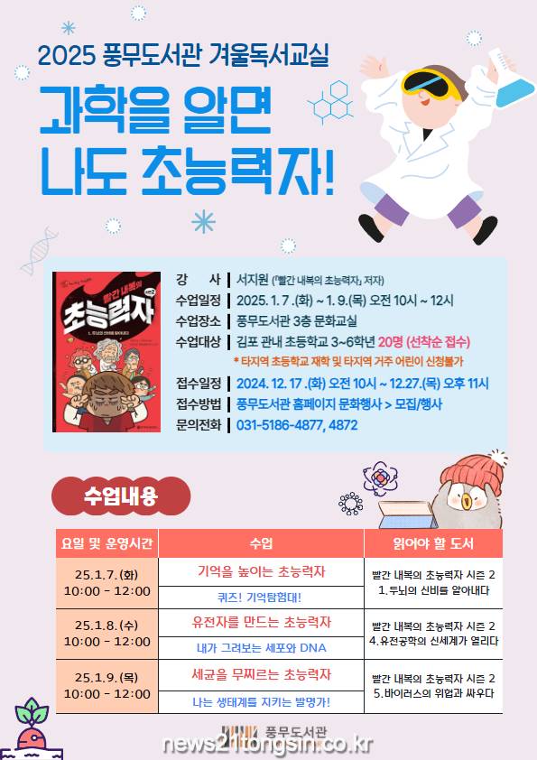 김포시(시장 김병수) 풍무도서관이 겨울방학을 맞이하여 2025년 풍무도서관 겨울독서교실 ‘과학을 알면 나도 초능력자!’를 오는 2025년 1월 7일 화요일부터 1월 9일 목요일까지(오전 10시부터 12시까지) 풍무도서관 3층 문화교실에서 3일간 운영한다고 밝혔다.