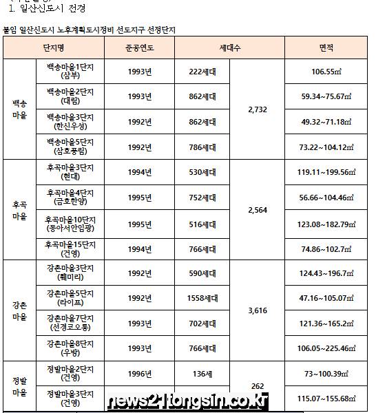 지난 9월 27일까지 선도지구 공모 접수된 총 22곳 특별정비예정구역의 공모신청서, 동의서 등 신청서류에 대한 검증 및 평가를 통해 국토부와 협의한 결과, 백송마을 1․2․3․5단지(2,732호), 후곡마을 3․4․10․15단지(2,564호), 강촌마을 3․5․7․8단지(3,616호), 정발마을 2․3단지(262호)가 선도지구로 최종 선정됐으며, 총 선정물량은 9,174호이다.