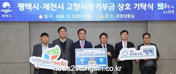 평택시(시장 정장선)는 지난 3일 시청 종합상황실에서 자매결연 도시인 제천시와 ‘고향사랑기부금 상호 기탁식’을 개최했다. 이날 행사는 평택농협과 제천농협의 임직원들이 지역농산물 소비를 늘리고 지역경제를 활성화하기 위해 자발적인 기부 참여로 이루어졌다.