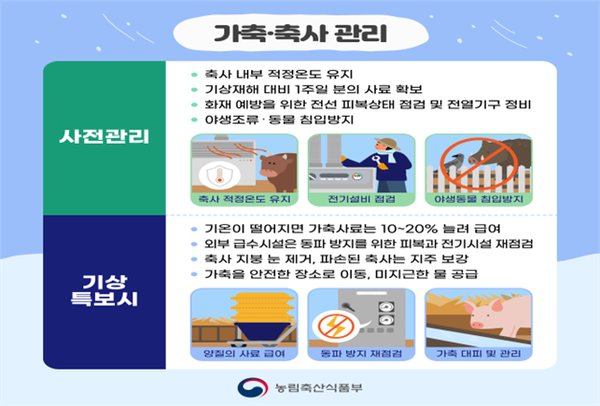□ 이와 함께 가축과 축사 관리 요령도 안내했다. 구체적으로는 축사 내부 적정 온도를 유지하고, 폭설에 대비해 최소 1주일 분량의 사료를 확보하며, 축사 화재 예방을 위해 피복 상태와 전열기구를 점검하도록 했다. 비닐하우스는 사전 점검과 보강 지주 설치, 지붕 위에 쌓인 눈 쓸어 내리기 등을 당부했다.