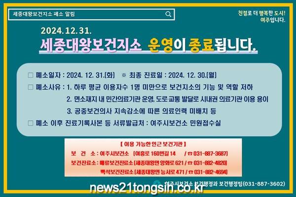 2024. 12. 31. 세종대왕보건지소 운영이 종료되었다.