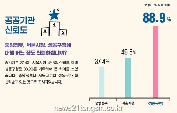 조사에 따르면 기관 신뢰도 부문에서 성동구민 10명 중 8명 이상(88.9%)이 성동구청을 신뢰하는 것으로 나타났다. 이는 중앙정부(37.4%)와 서울시청(49.8%)에 비해 월등히 높은 수치로 성동구청이 구민들로부터 가장 신뢰받는 기관임을 보여준다.
