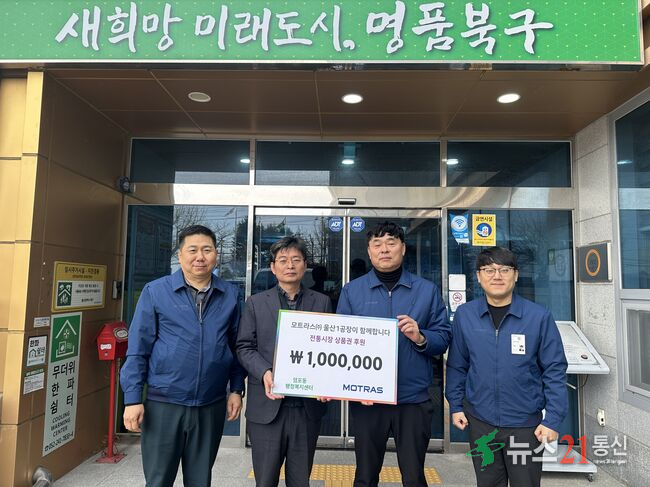 [뉴스21 통신=최병호 ](사진출처=울산북구청)모트라스(주)는 4일 북구 염포동 행정복지센터에 설 명절 맞이 이웃돕기 온누리상품권 100만원 상당을 전달했다.
