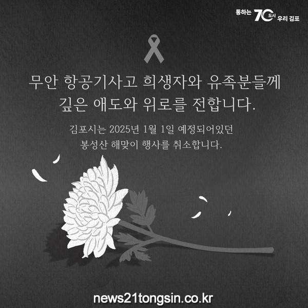 김병수 시장은 “희생자 여러분의 명복을 빌며, 유가족께 깊은 애도와 위로의 말씀을 전한다”며 “시는 국가적 참사 애도에 동참하고 희생되신 분들의 명복을 빌고자 연말연시 행사를 취소·축소했다”고 전했다.
