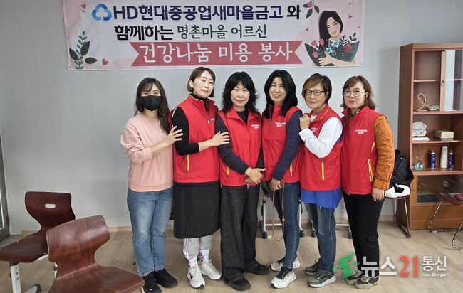 [뉴스21 통신=최세영 ] ▲ 사진설명= 앞줄왼쪽에서 세번째 김설옥회장10월 31일(금) 오전, 울산 북구 명촌마을회관이 가위 소리와 웃음으로 환해졌다. 헤어디자인봉사단(회장 김설옥)은 HD현대중공업새마을금고와 손잡고 ‘명촌마을 어르신 건강나눔 미용 봉사’를 열어 지역 어르신들의 단정한 용모...
