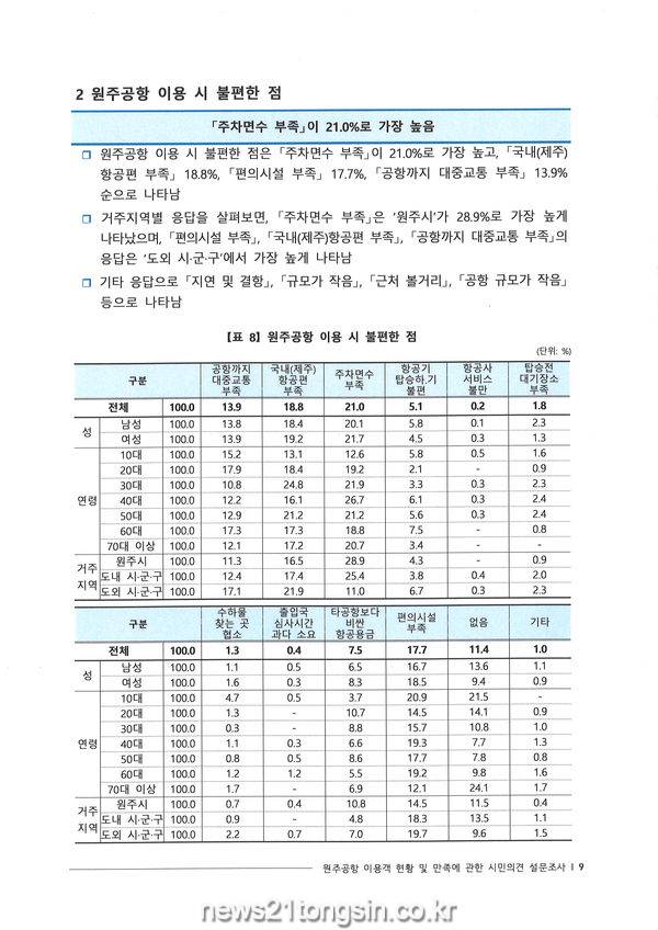 설문조사 결과 ‘공항 이용 시 불편한 점’으로 ‘주차면수 부족’이 가장 높은 비율을 차지했고, 이어 ‘국내(제주) 항공편 부족’, ‘편의시설 부족’, ‘공항까지 대중교통 부족’ 순이며, 그 외 ‘항공기 탑승하기 불편’, ‘결항 시 대책 필요’ 등의 의견이 개진됐다.