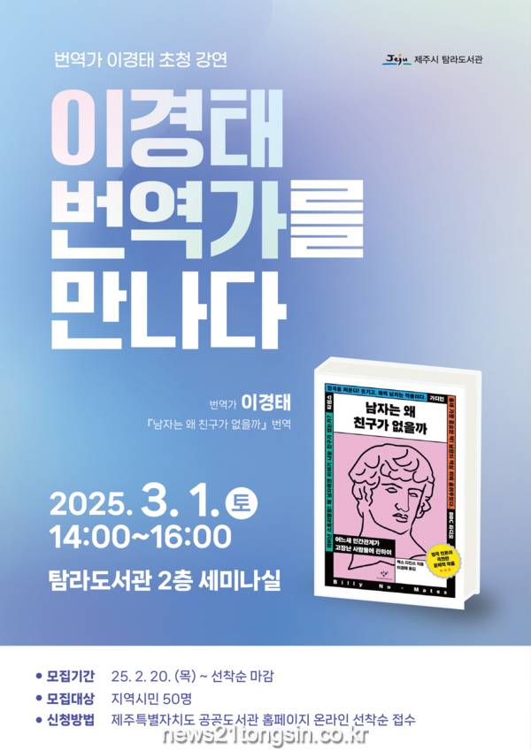 ▲ 사진=제주시 탐라도서관은 오는 3월 1일 도서관 세미나실에서 ‘이경태 번역가를 만나다’강연을 개최하고, 참여자 50명을 선착순 모집한다.