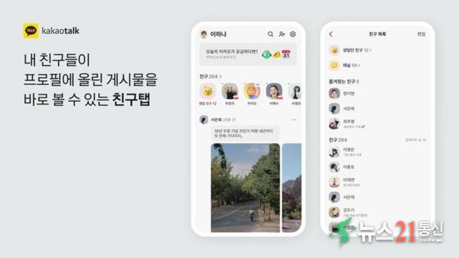 [뉴스21 통신=추현욱 ] 카카오가 카카오톡 친구탭을 과거의 목록형 UI로 복원했다. 9월 23일 개편 발표 이후 약 3개월 만의 복원이다.카카오는 16일 카카오톡 친구탭에서 친구 목록을 바로 확인할 수 있도록 하는 업데이트(버전 25.11.0)를 순차적으로 진행한다고 밝혔다.이번 업데이트를 통해 카카오톡 친구탭은 친구 목록이 표시되는 화면을 기..