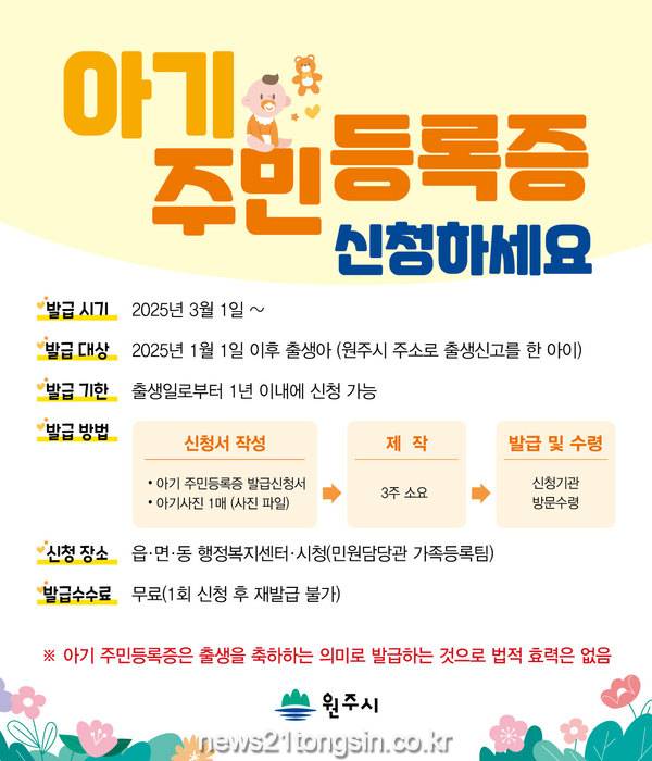 시 관계자는 “소중한 출생의 가치를 담은 아기주민등록증을 통해 가족들이 따뜻한 추억을 간직하길 바란다.”라며, “앞으로도 다양한 출산 및 민원편의 시책을 마련해 아이 낳고 키우기 좋은 원주시를 만들어 나가겠다.”라고 전했다.
