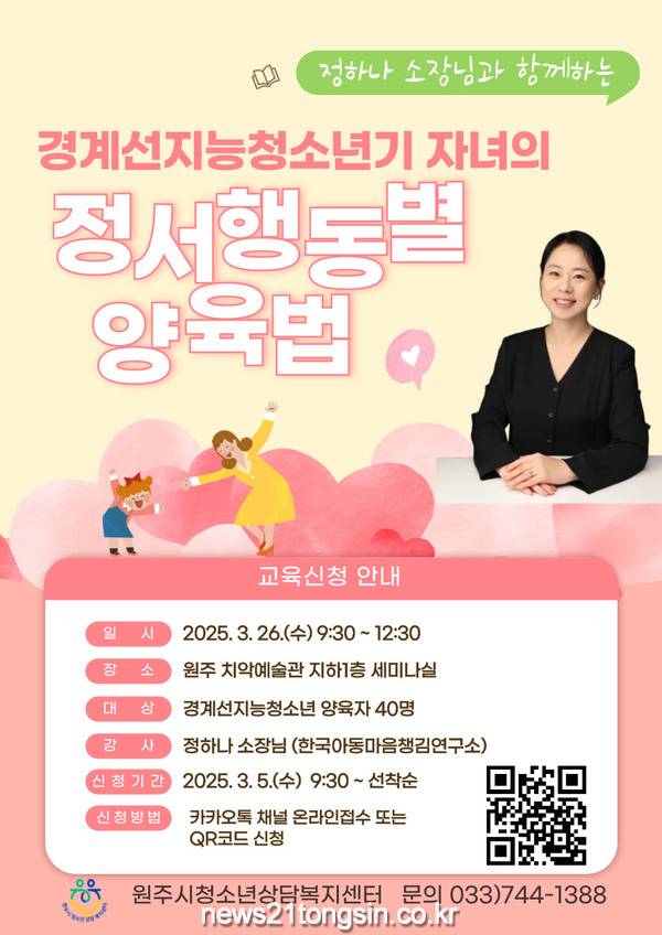 ▲  사진=원주시원주시청소년상담복지센터는 오는 26일(수) 오전 9시 30분 치악예술관 지하1층 세미나실에서 ‘경계선지능청소년기 자녀의 정서행동별 양육법’ 부모교육을 실시한다.