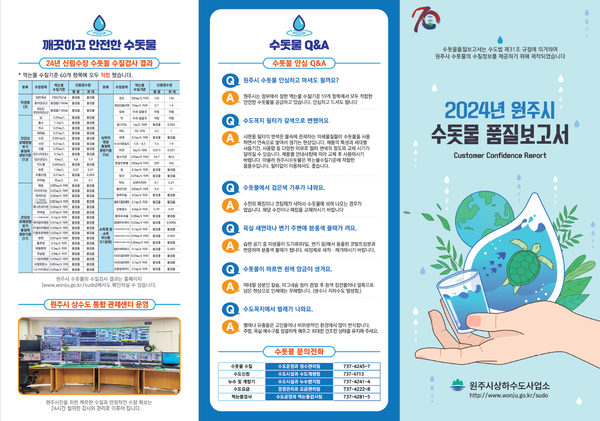 시는 지난해 원주정수장, 신림정수장, 광역상수도(송전정수장)를 대상으로 매월 실시한 수돗물 수질검사 결과를 바탕으로, ‘원주시 수돗물 품질보고서’를 제작했다.