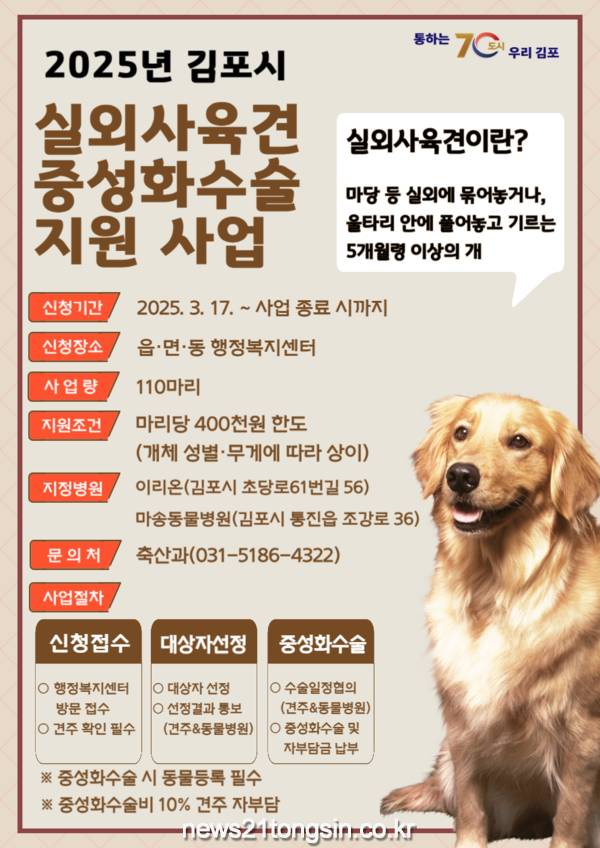 지원 희망자는 각 읍면동 행정복지센터에서 개인 또는 마을별 집단(마을 이·통장) 신청이 가능하며, 올해 사업량 110마리 소진 시 자동 종료된다.