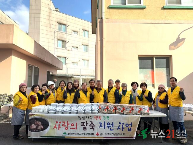 ▲사진제공:울주군청 울주군 상북면 지역사회보장협의체(공동위원장 신용석, 정상화)가 16일 동짓날을 맞아 동지팥죽 지원사업을 추진했다.이날 위원들은 취약계층 어르신 50세대를 방문해 직접 만든 동지팥죽과 간식을 전달하고 안부를 확인하며 따뜻한 마음을 전했다.정상화 공동위원장은 “상북면의 어르신들이 조금이나마 몸과 마..