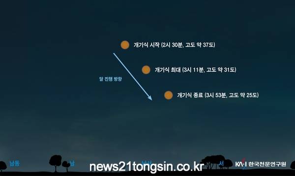 ▲ 사진=한국천문연구원개기월식은 지구 반그림자에 달이 들어가는 반영식을 시작으로, 달이 지구 본그림자에 일부분 가려지는 부분식이 새벽 1시 26분 48초에 시작된다. 달이 지구 그림자에 완전히 들어가는 개기식은 2시 30분 24초에 시작되며, 3시 11분 48초에 최대가 된다. 3시 53분 12초에 개기식이 종료되며, 이후 식의 전 과정은 5시 56분 36초에 끝이 난다. 이번 월식은 아시아, 러시아, 호주, 인도양, 아프리카, 유럽에서 볼 수 있다.