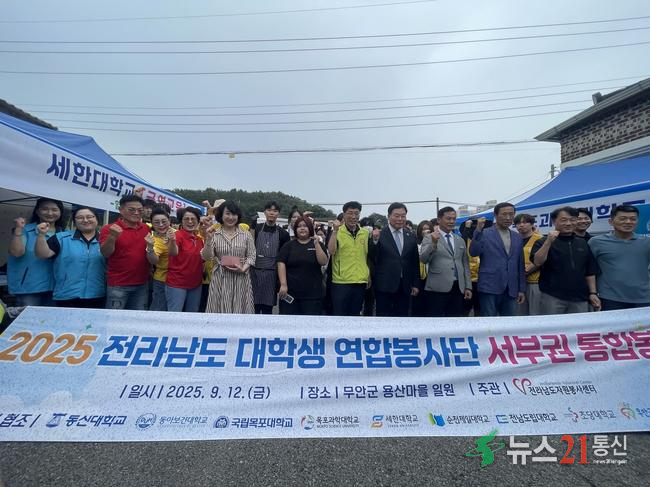 전라남도자원봉사센터(센터장 김상길)는 지난 9월 12일 무안 용산마을에서 열린 ‘전라남도 대학생연합봉사단 서부권 통합 봉사활동’을 성공적으로 마쳤다고 밝혔다. 이번 봉사에는 동신대, 동아보건대, 목포과학대, 목포대, 전남도립대, 초당대, 세한대, 순천제일대 등 8개 대학 100여 명의 대학생이 함께했다.