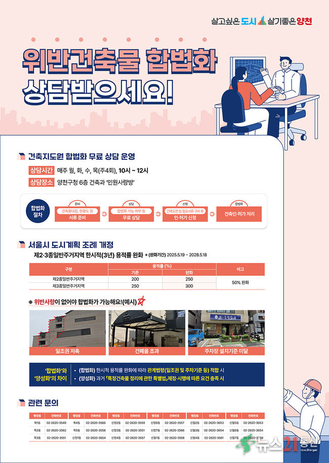 양천구는 이번 제도 시행에 발맞춰 ‘위반건축물 합법화 상담센터’를 운영하고 무단 증축 등으로 불이익을 겪는 건축주들이 용적률 완화의 혜택을 받을 수 있도록 무료 상담을 지원한다.