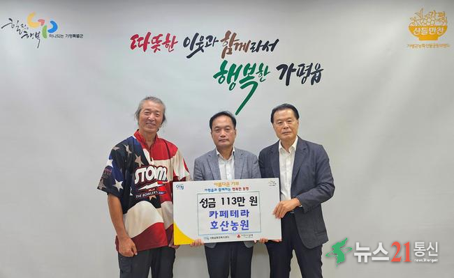 가평군에 소재한 카페테라와 호산농원은 최근 가평읍 행정복지센터를 찾아 이웃돕기 성금 113만 원을 전달했다.