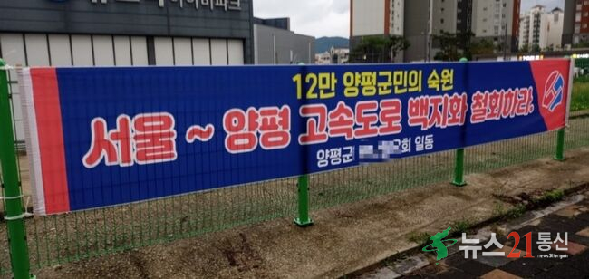 경기도 양평군 곳곳에 서울~양평고속도로 종점 변경 특혜 의혹과 고속도로 백지화에 대한 우려가 뒤얽힌 현수막들이 나부끼고 있다.