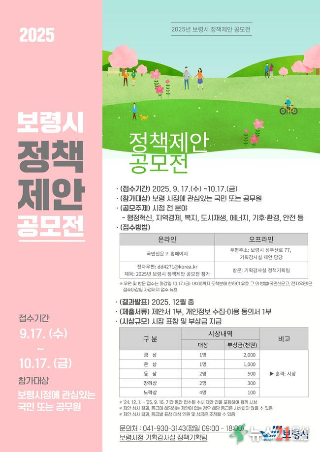보령시는 오는 10월 17일까지 ‘2025년 보령시 정책 제안 공모전’을 개최한다고 밝혔다. 이번 공모전은 지역사회 발전과 시정 혁신을 위해 시민들의 다양한 목소리와 창의적인 아이디어를 시정에 적극 반영하고자 마련됐다.