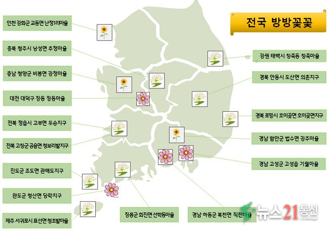 경관작물은 ‘경관보전직불사업’을 통해 지원되며, 지자체와 협약을 맺은 농가들이 봄·가을에 꽃을 심어 계절마다 색다른 풍경을 연출한다. 대표적인 가을 명소로는 전북 정읍 두승지구, 전남 장흥 선학동마을, 인천 강화 교동면, 경남 함안 강주마을, 대전 대덕 장동마을, 전남 해남 대진마을 등이 꼽힌다.