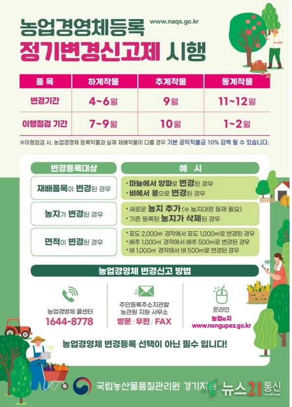 이에 농관원은 올해부터 정기 변경신고제를 도입해 운영 중이다. 1~3월에는 마늘·양파, 4~6월에는 하계작물, 9~10월은 추계작물을 대상으로 변경신고 기간을 정하고 전국적인 홍보를 강화하고 있다.