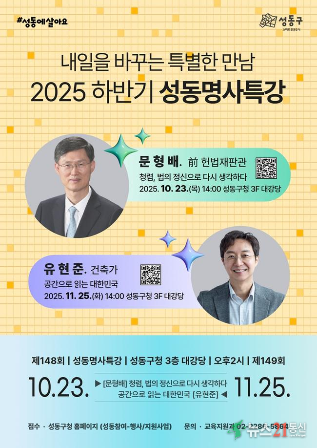 성동구는 문형배 전 헌법재판관과 유현준 건축가를 초청해 하반기 명사특강을 개최한다.(2025년 하반기 성동명사특강 홍보 포스터 이미지)