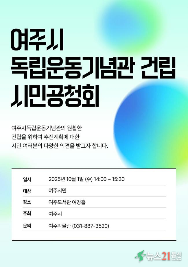 여주시는 오는 10월 1일 오후 2시 여주도서관 여강홀(여양로 190-17)에서 여주시독립운동기념관 건립 시민공청회를 개최한다고 밝혔다.