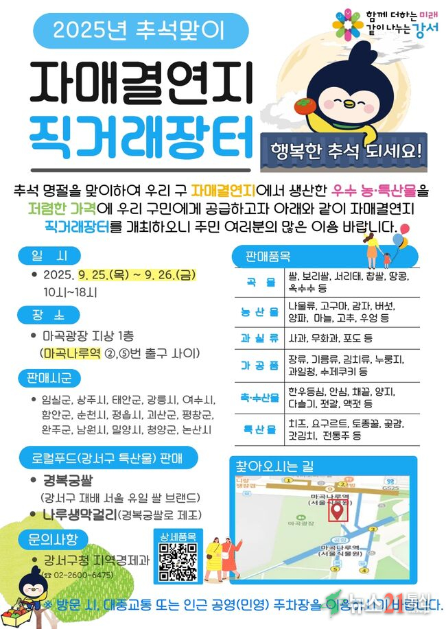 직거래장터는 25일과 26일 오전 10시부터 오후 6시까지 마곡광장 지상(마곡나루역 2, 5번 출구 사이)에서 열린다.