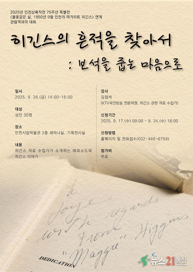 인천광역시(시장 유정복) 시립박물관은 9월 26일‘불꽃같은 삶: 1950년 9월 인천의 마거리트 히긴스’ 특별전과 연계해 ‘관람객과의 대화’ 행사를 개최한다고 밝혔다.