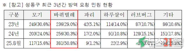 성동구의 최근 3년간 방역 요청 민원 현황을 분석한 결과, 바퀴벌레 관련 민원은 2023년 236건에서 올해 8월 기준 381건으로 약 2년 만에 145건이 증가했다. 특히 올해 전체 방역 민원 중 50.8%가 바퀴벌레 방역 요청으로 가장 높은 비율을 차지했다.