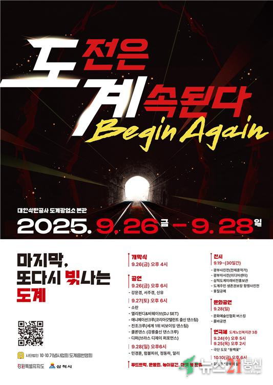 사단법인 10·10기념사업회와 도계읍번영회가 주관하는 「도전은 계속된다. Begin Again」 행사가 오는 9월 26일부터 28일까지 사흘간 대한석탄공사 도계광업소 본관 일원에서 열린다.