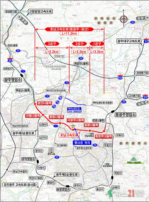 호남고속도로 동광주-광산 확장공사 기공식호남고속도로 동광주IC~광산IC 구간이 기존 4차로에서 6~8차로로 확장된다. 이는 1986년 4차로로 확장된 이후 25년 만에 추진되는 대규모로 도로 확장 공사이다.