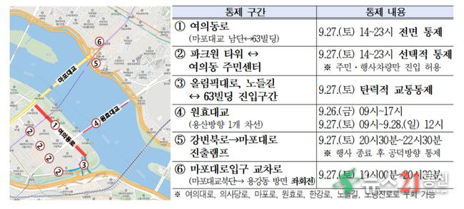 행사장 주변 17개 역사에는 안전요원 306명이 배치돼 질서 유지와 동선 안내를 돕는다. 또 한강대교에서는 오후 4시~9시 버스 15개 노선이 무정차 통과하고, 택시 승하차도 금지된다. 공공자전거 따릉이와 민간 전동킥보드·전기자전거 대여 및 반납 역시 여의도·마포·용산·동작 일대에서 일시 중지된다.