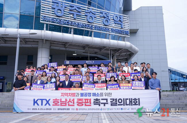 광주광역시는 광주광역시의회, 5개 자치구, 광산구의회, 시민 등과 함께 23일 광주송정역 광장에서 ‘KTX 호남선 차별·불공정 해소 촉구 결의대회’를 열고 KTX 운행 개선안을 정부에 건의했다.