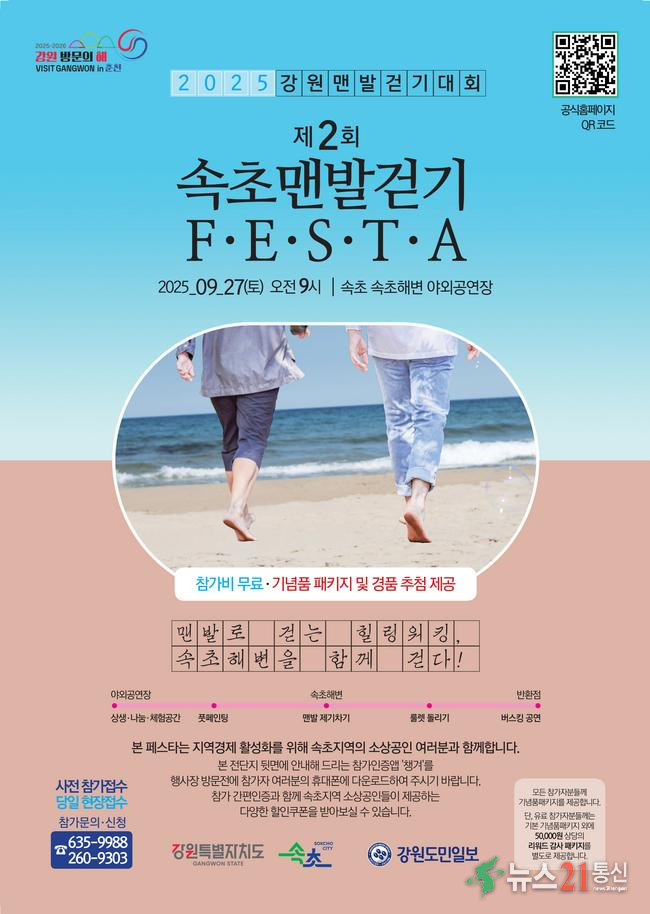 걷기 행사가 끝난 뒤에는 속초해변 상설무대에서 버스킹 공연과 경품 추첨이 이어진다. 풍성한 선물과 다채로운 무대 공연은 참가자들에게 잊지 못할 추억을 선사할 것으로 기대된다.
