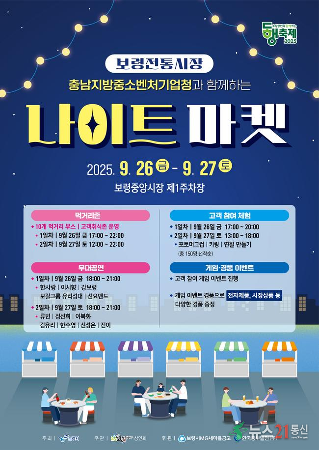 보령시가 오는 26일부터 27일까지 중앙시장 제1주차장에서 ‘보령중앙시장 나이트마켓’을 개최한다. 이번 행사는 보령시가 주최하고 중앙시장 상인회가 주관하며, 시민과 관광객을 위한 다채로운 먹거리와 공연, 체험 프로그램이 준비됐다.