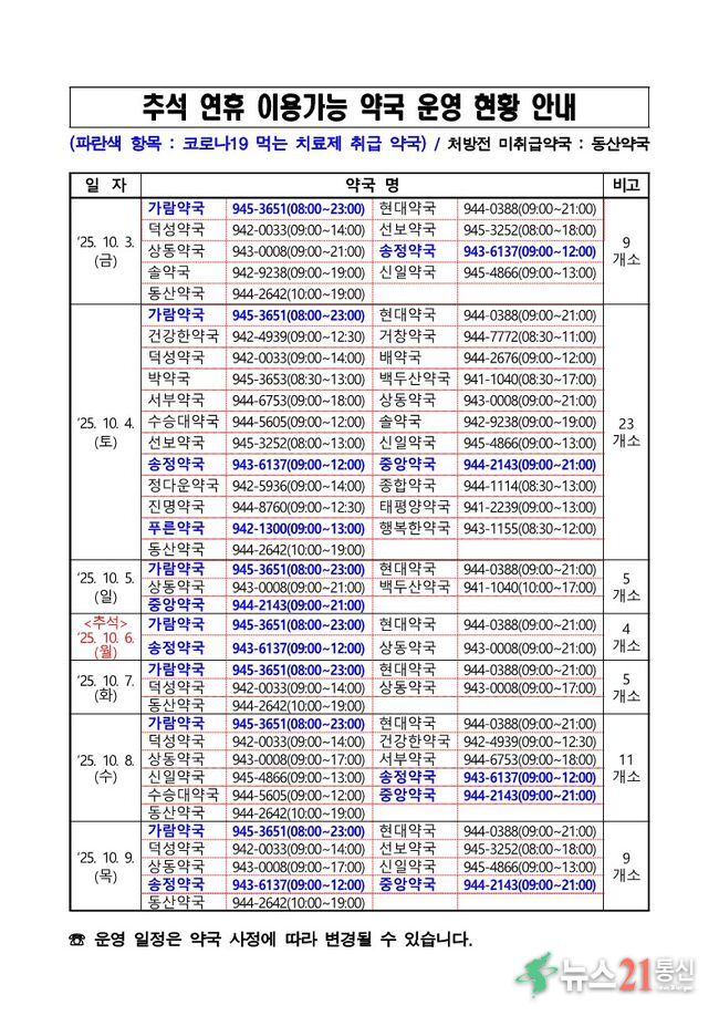 ‘추석 연휴 문 여는 병·의원 및 약국 운영 현황과 세부일정’은 응급의료포털 및 주요 포털에서 ‘명절진료’ 등 검색을 통해 확인할 수 있으며, 보건복지콜센터, 구급상황관리센터, 시도 콜센터를 통해 유선 문의 가능하다. 또한 군청과 보건소 누리집를 통해서도 확인할 수 있다.