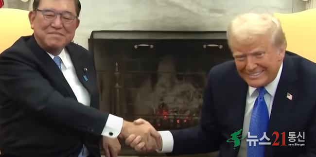 지난 2월 미국 워싱턴DC를 방문한 이시바 시게루 일본 총리가 도널드 트럼프 미국 대통령과 악수를 나누고 있다. (사진=SBS뉴스영상캡쳐)