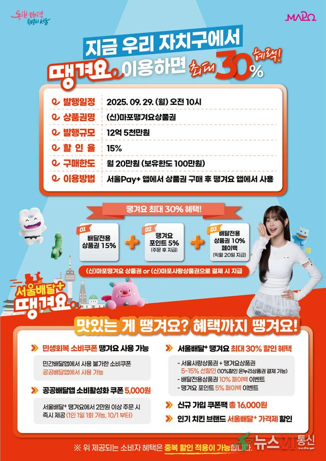마포구(구청장 박강수)는 오는 9월 29일 오전 10시부터 총 12억 5천만 원 규모의 ‘마포 배달전용상품권(마포땡겨요상품권)’을 첫 발행한다고 밝혔다.